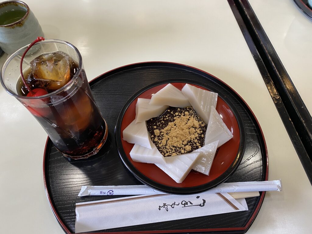 注文したのは、もちろん名物のくずもち。 ぷるんとした見た目に、きなこと黒蜜がたっぷり。ひと口食べると、やさしい甘さがじんわり広がって、走ったあとの体にしみる〜。