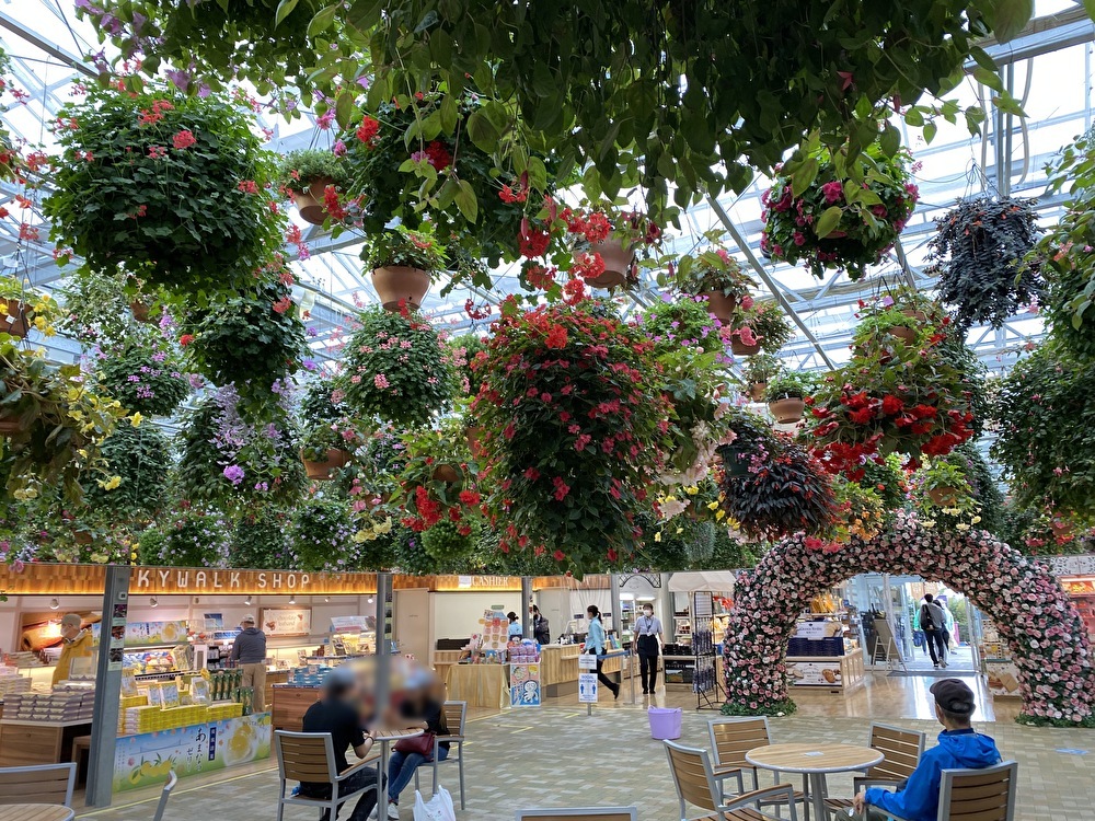 スカイウォークにあるスカイショップの天井には、色とりどりの花がふわっと咲いてて、まるで空の花畑。お店もひとつひとつがかわいくて、ついつい寄り道したくなる空間でした。