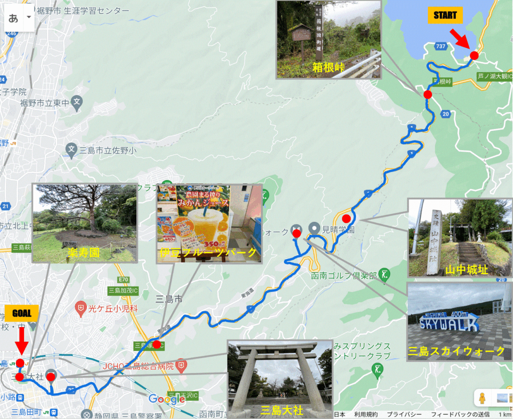 ゴールは三島駅。峠を越えて、空を渡って、果汁に癒されて、神様にご挨拶して…気づけば24.55km。ほとんど下りだったから「意外と元気かも?」なんて思ってたけど、翌日はしっかり筋肉痛。これも旅の勲章、うれしぃー。