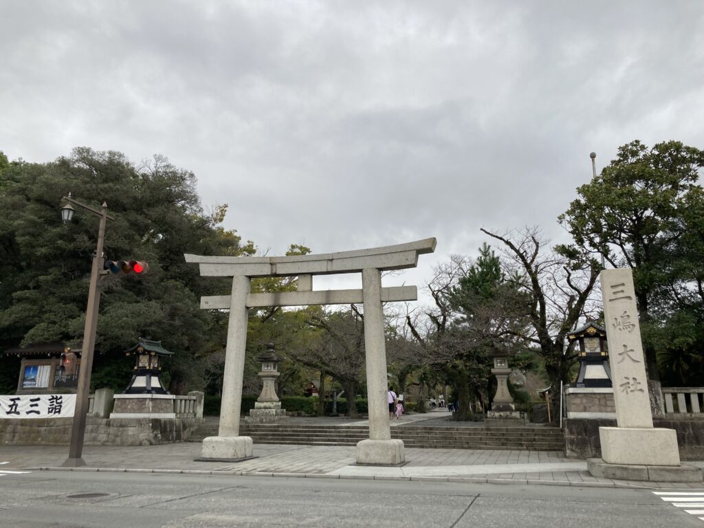 伊豆国一の宮、三嶋大社。源頼朝が源氏再興を祈願した場所としても知られていて、江戸の旅人たちもここで鰻を食べて一息ついたらしい。