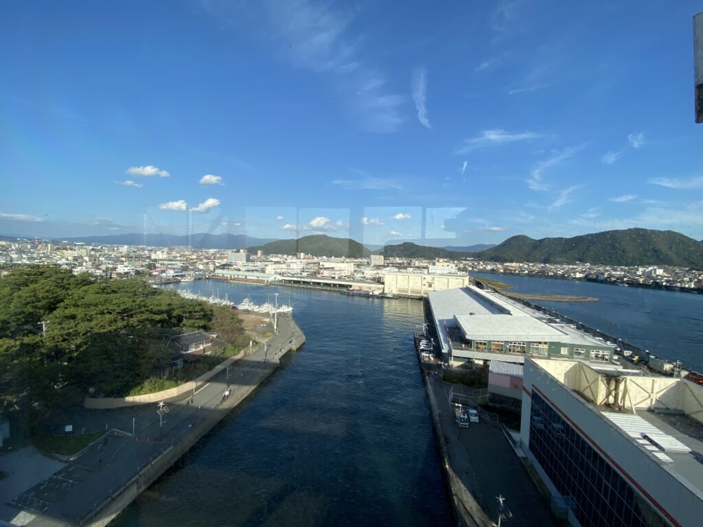 展望室は100円で入れて、港や富士山まで見渡せる絶景スポット。水門なのに、景色も楽しめる。びゅうお、ギャップがすごい。
