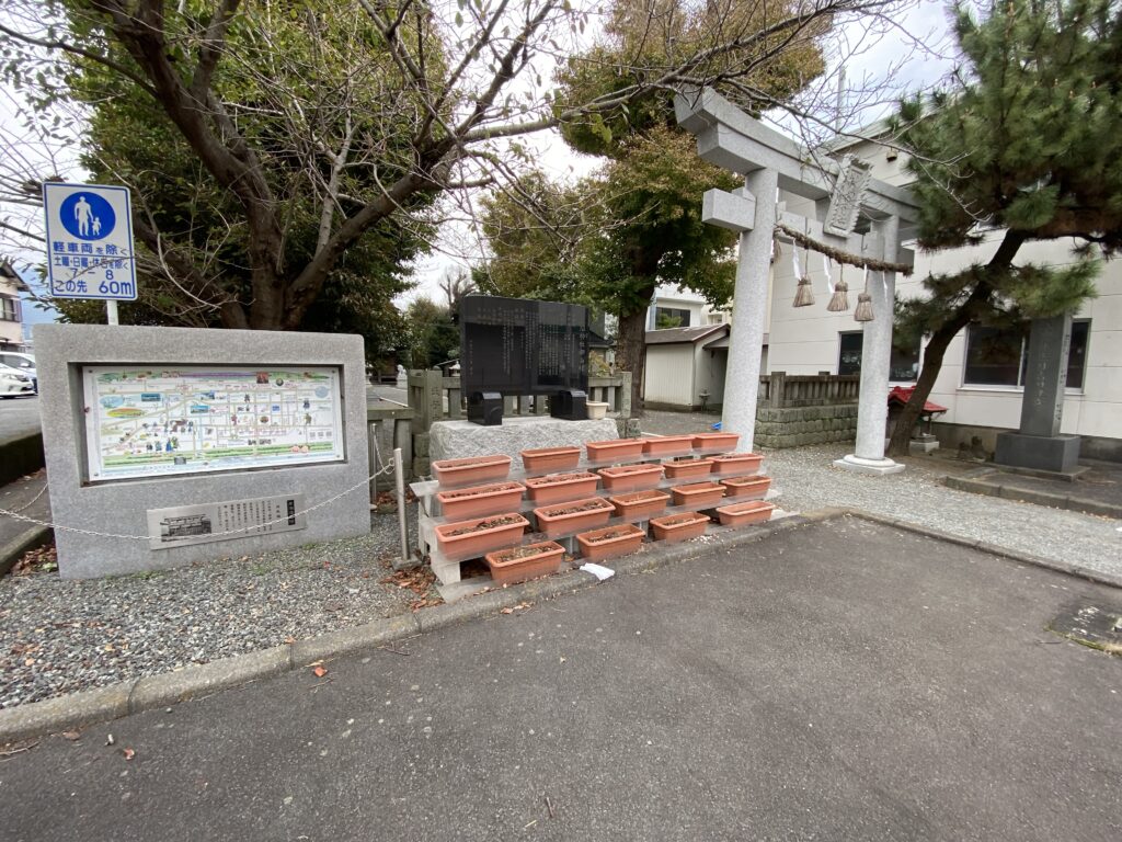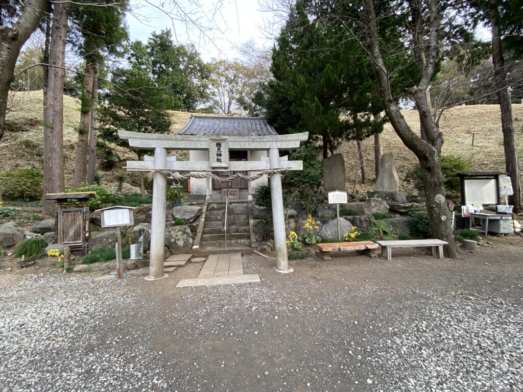 根古屋高尾山穂見神社の鳥居の右にある碑には、右側に北条早雲、左側に最後の城主・天野康景の名前が刻まれていて、時代の流れを感じます。
