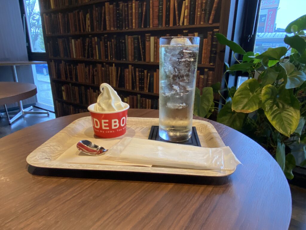 駅の中にあるカフェでひと休み。旅の締めくくりに、富士山ハイボールといでぼくのアイスクリームをいただきました。