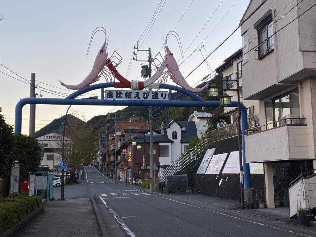 由比駅にゴール! 桜えびの町らしく、駅前のアーチには大きな桜えびのモニュメント。町全体が「ようこそ」と言ってくれてるみたい。