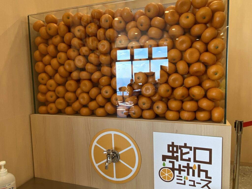 展望台の近くで、なんとも気になる蛇口を発見。 なんと、みかんジュースが出るらしい…! とはいえ、夢のように流れ出すわけじゃなくて、ちゃんとお金を払って、コップに注ぐスタイル。