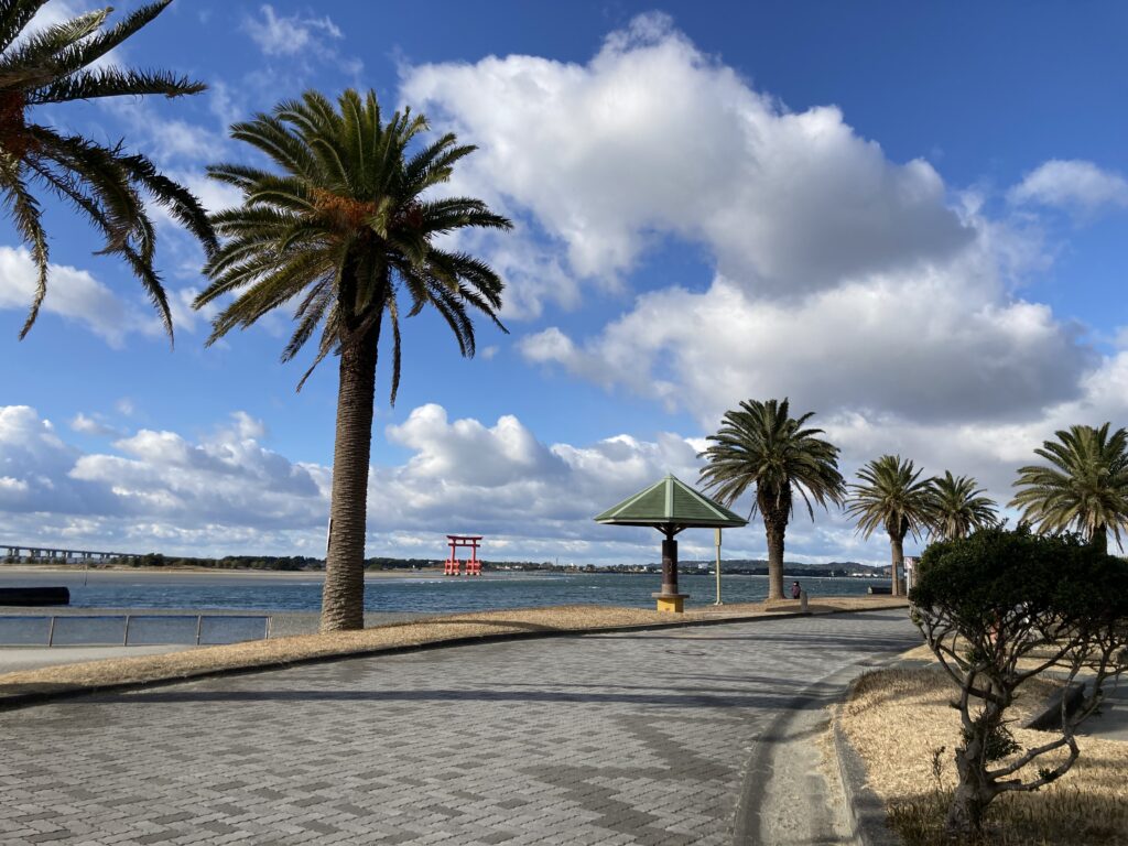 実はこの鳥居、神社のものではなく「観光シンボルタワー」として1973年に建てられたもの。 でもすぐそばには、島の名前の由来にもなった弁天神社があって、縁結びや海上安全のご利益もあるそうだよ。