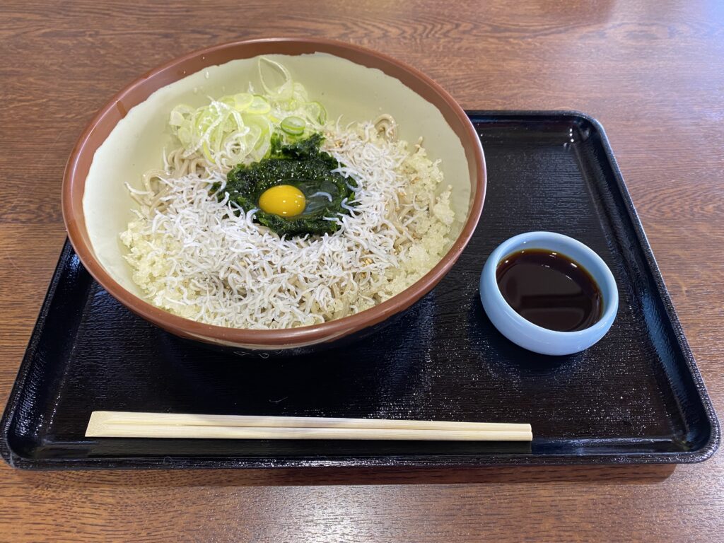 揚げ玉、しらす、生のり、長ネギ、うずらの卵がのったお蕎麦に、ごま油入りの出汁醤油をかけて、まぜまぜ…🍜 生のりの風味がすごく濃くて、しらすの塩気と相性ばっちり。 香ばしい出汁醤油が全体をまとめてくれて、これはクセになる味…🤤
