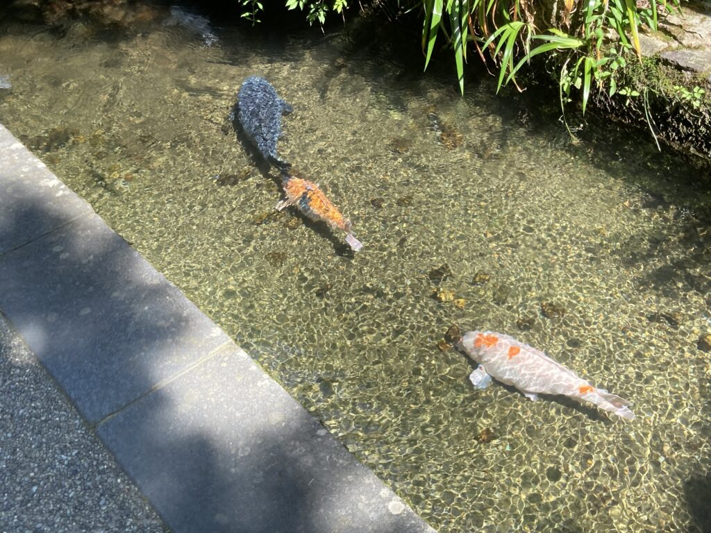 透き通った流れの中には、コイや岩魚、あまご、アユまで泳いでいて、まるで小さな水族館みたい🐟✨ 水の音を聞きながら、のんびり歩くのにぴったりの寄り道スポットでした。