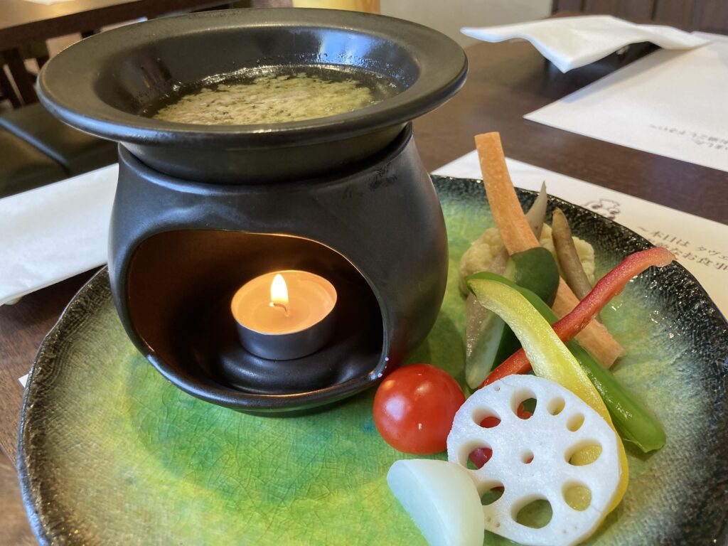 この日は「PranzoA(選べる前菜・パスタ・自家製パン・ドリンク)」をいただきました🍽️ 前菜は「美味野菜のバーニャカウダ」。新鮮な野菜を、あったかいバーニャカウダソースにつけて食べるのが最高!