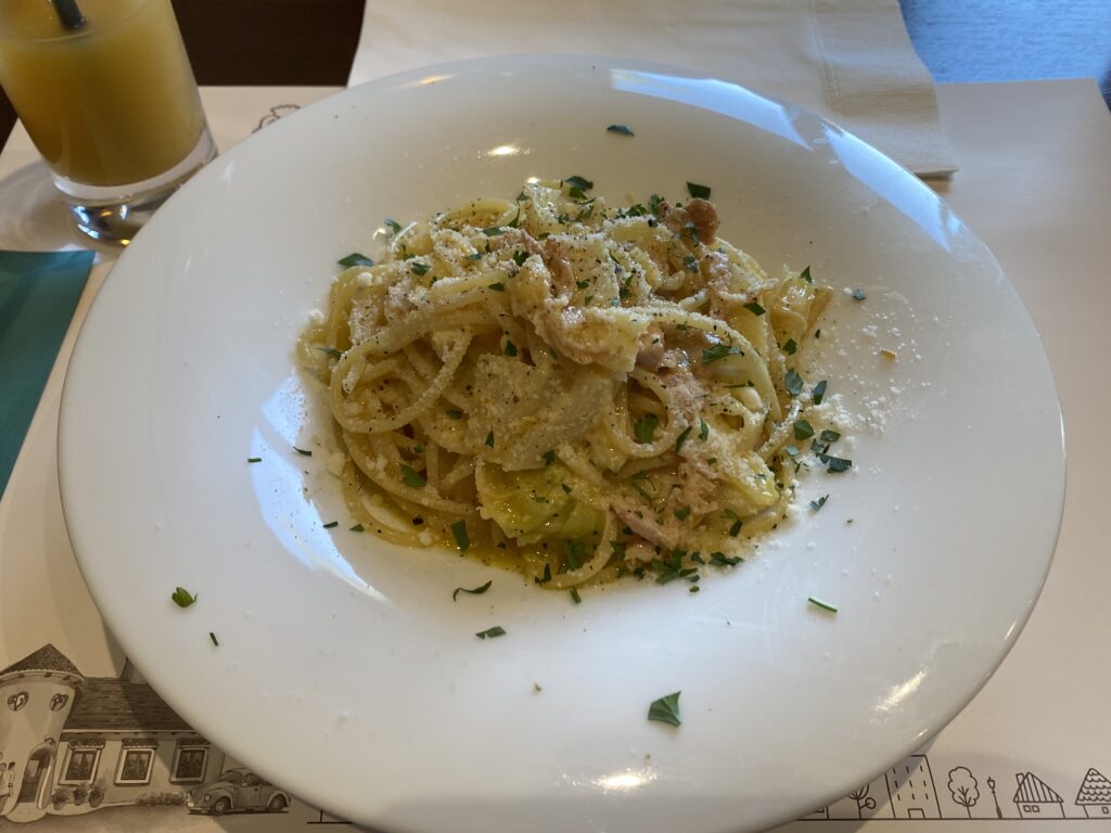 パスタは「鶏肉とビアンコラグーソース」。鶏肉とキャベツの旨みがしっかり出たスープに、麺がよく絡んで美味しい〜。 生のパセリがアクセントになっていて、ふわっと香るたびにちょっと幸せな気分に🍃 スパゲッティの量は少なめ(50g)、普通(70g)、多め(90g)から選べるので、お腹の具合に合わせて調整できます。 ちなみに自家製パンもついてくるので、食べすぎ注意かも…!