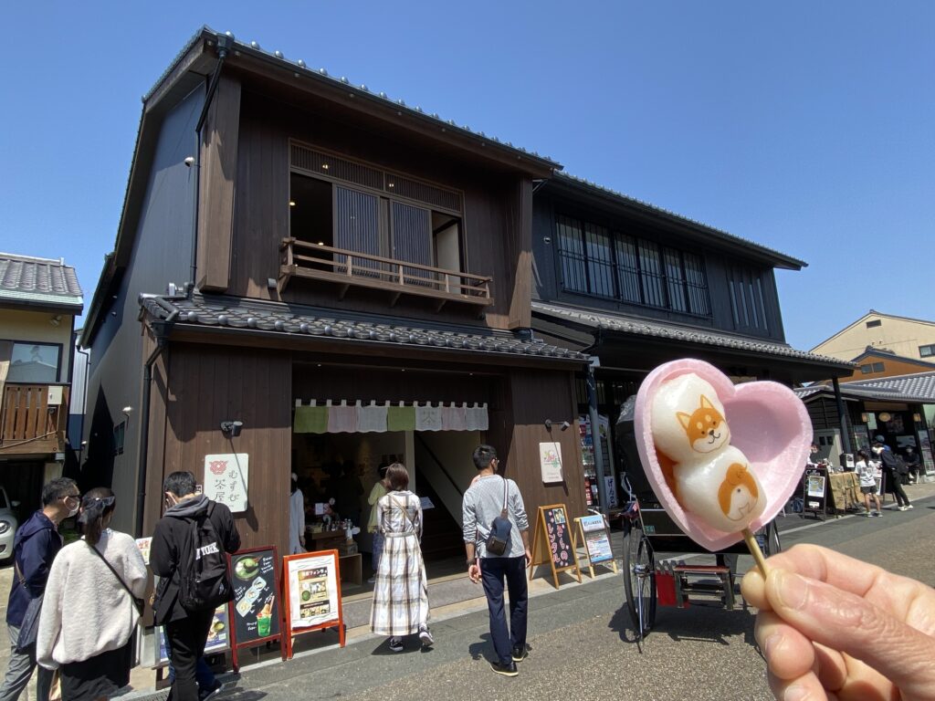 犬山城下町の食べ歩きで、ひときわ目を引くのが「むすび茶屋」のみたら柴だんご。 なんといっても、柴犬のお顔が描かれたお団子がとにかくかわいい! ちょこんと描かれたお尻がまた…キュートすぎて、食べるのがもったいないくらい🐕💕