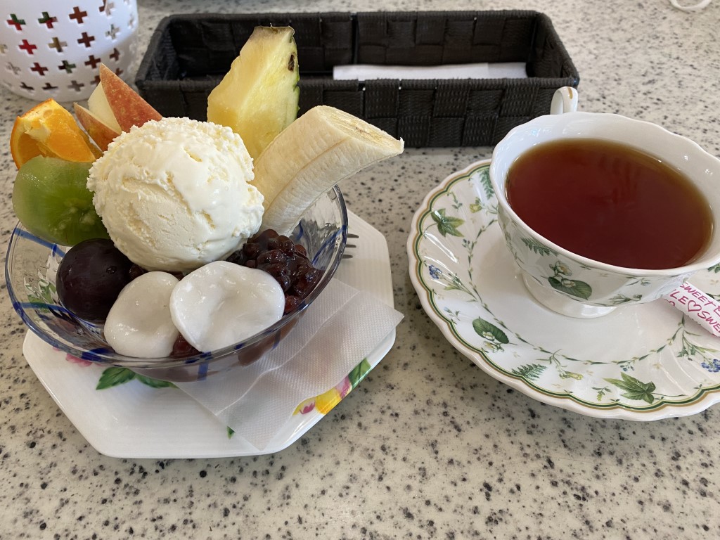 そしてクリームあんみつには、バナナ・パイナップル・りんご・オレンジ・キウイ・巨峰がたっぷり!フルーツでビタミン補給もバッチリ。 紅茶も香りがよくて、カップもおしゃれで、ほっとひと息つける素敵な時間だったよ!